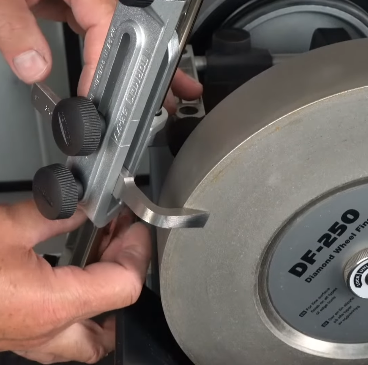 - At 00:46, there is a great explanation of sharpening a tool with a radiused end using the SE-77 Square Edge Jig.